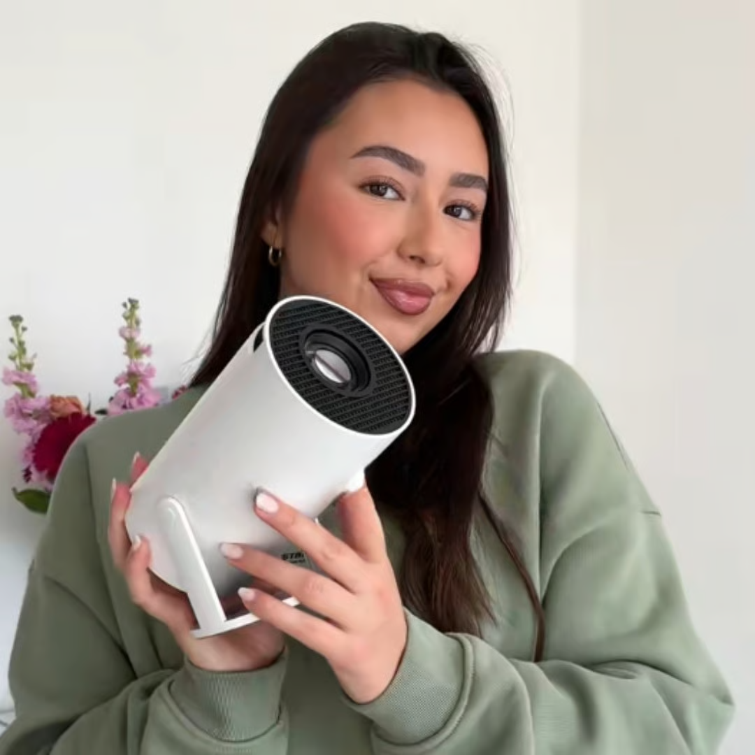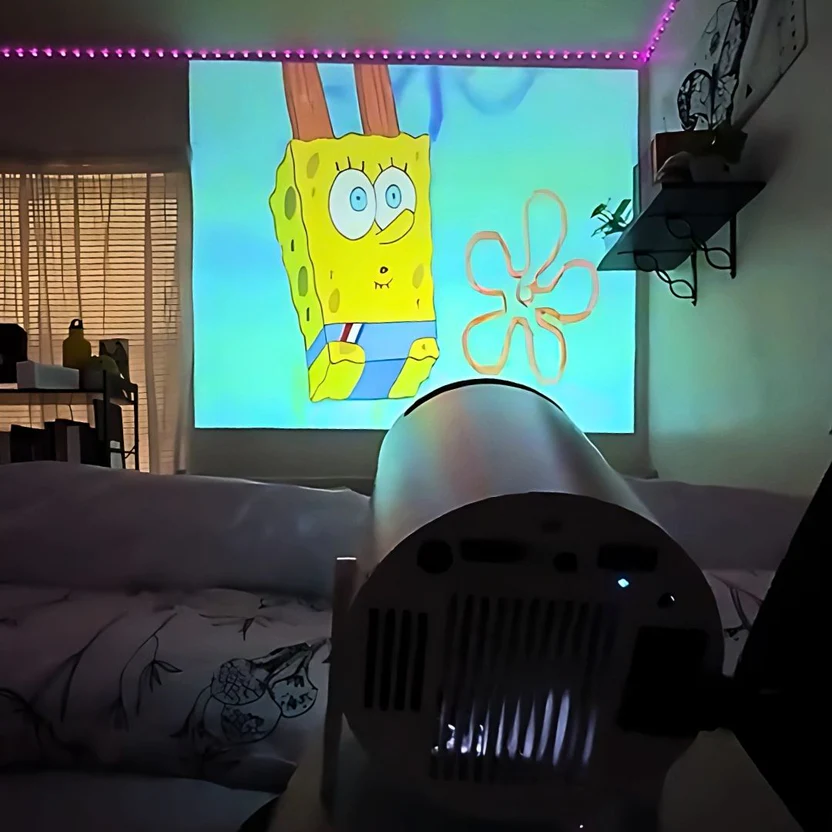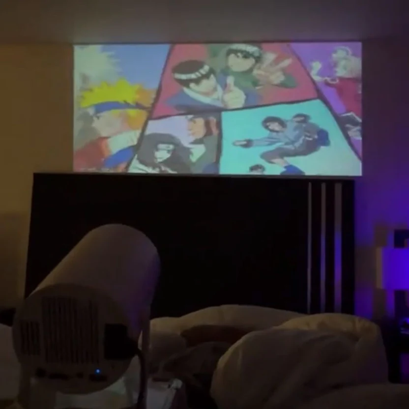 Vårt unika 180° stativ låter dig projicera på vilken vägg som helst, eller till och med rakt upp i taket. Njut av film i sängen eller skapa mysig atmosfär var du vill.